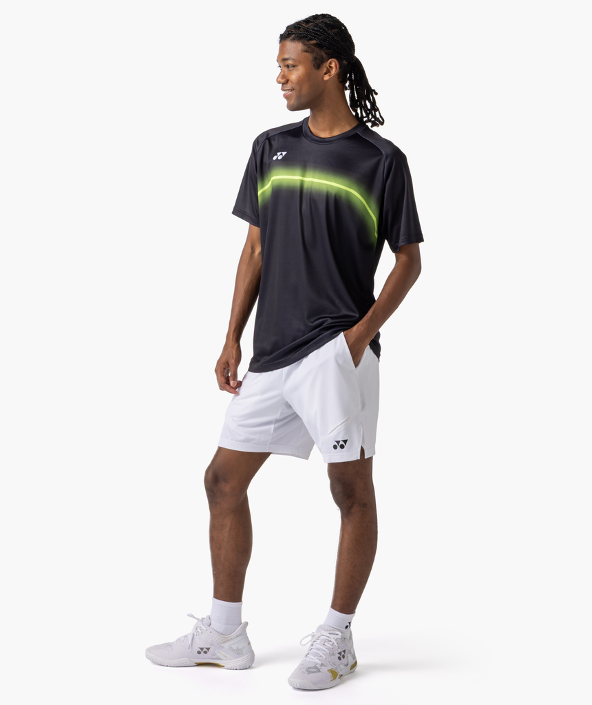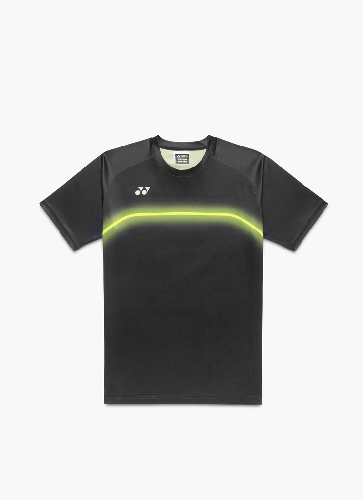 he Yonex Unisex Practice T-Shirt 16859 Black is part of the new Yonex Practice Collection 2026. The black base color is complemented by an eye-catching neon line graphic on the chest, which gives the shirt a modern and dynamic look while emphasizing the sporty character. The curved line structure adds visual depth and makes the design particularly eye-catching on the court, while the clean style remains typical of professional sportswear. Made of lightweight and breathable functional material, the shirt offers high wearing comfort and optimal freedom of movement. The Yonex Practice T-Shirt 16859 is ideal for training, club operations and various racquet sports such as badminton or tennis.